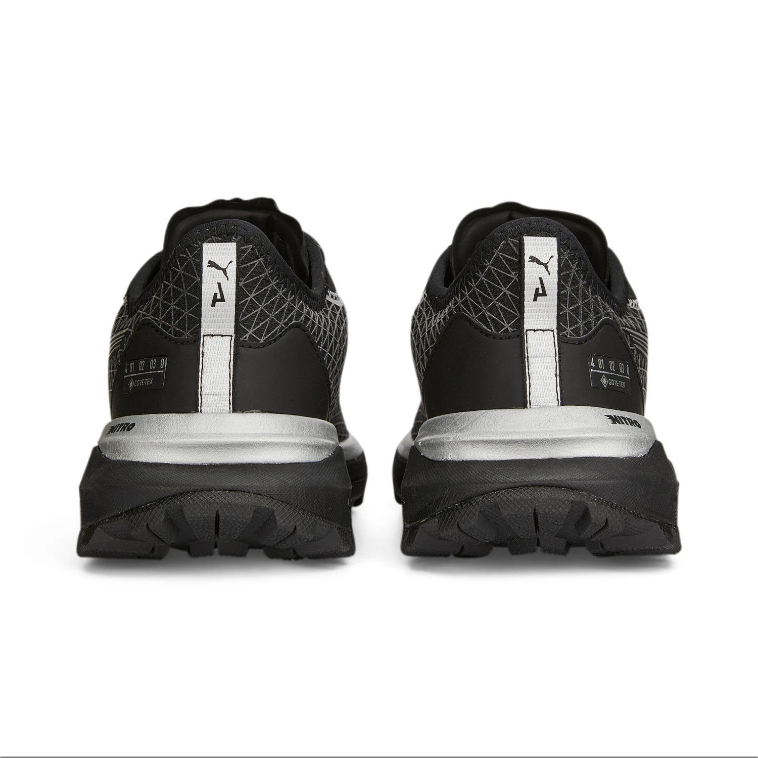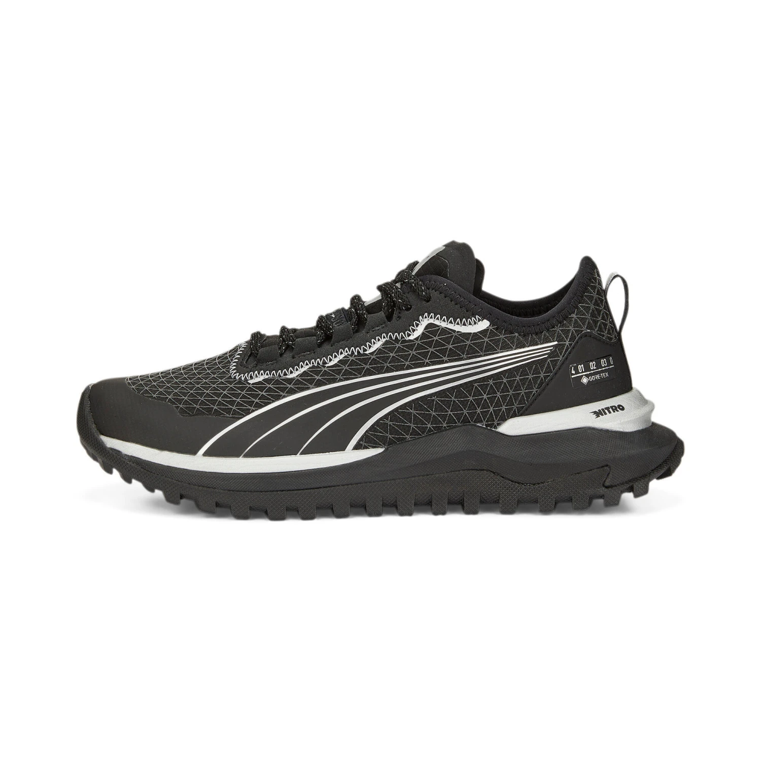 - Waterproof GORE-TEX® fabric upper – Reflective design elements – Forefoot drainage ports – Best for: Neutral pronators – Heel-to-toe drop: 8mm – Cushioning level: Max – PUMA Formstrip on the lateral side