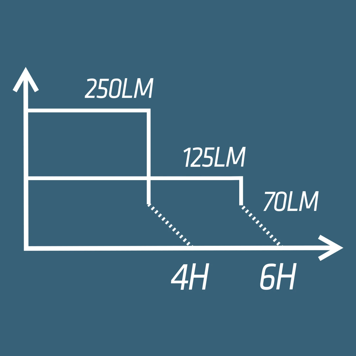 2 manual light settings: 250 lumens, 125 lm.